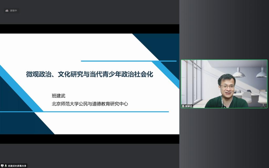 班建武教授首先从政治的存在形态与政治社会化出发,介绍了政治的基本意涵及三种形态。他通过分析宏观与中观政治主导下的政治社会化实践,引出当前主流政治社会化实践中微观政治的缺位。接着,他以新的文化洞见——文化研究为基础,阐明了文化研究与微观政治的内在共通旨趣,并从宏观政治社会化的强结构主义特征出发,论述了结构主义政治社会化的立论前提与时代挑战,从而提出青少年政治社会化的基本立场由被动接受走向主动建构、内容由宏观领域拓展到微观世界、语境为主流话语与大众文化的整合的基本观点。最后,班建武教授以政治社会化的四个生存悖论为结尾,分享了其对当代青少年政治社会化的新议题的思考。