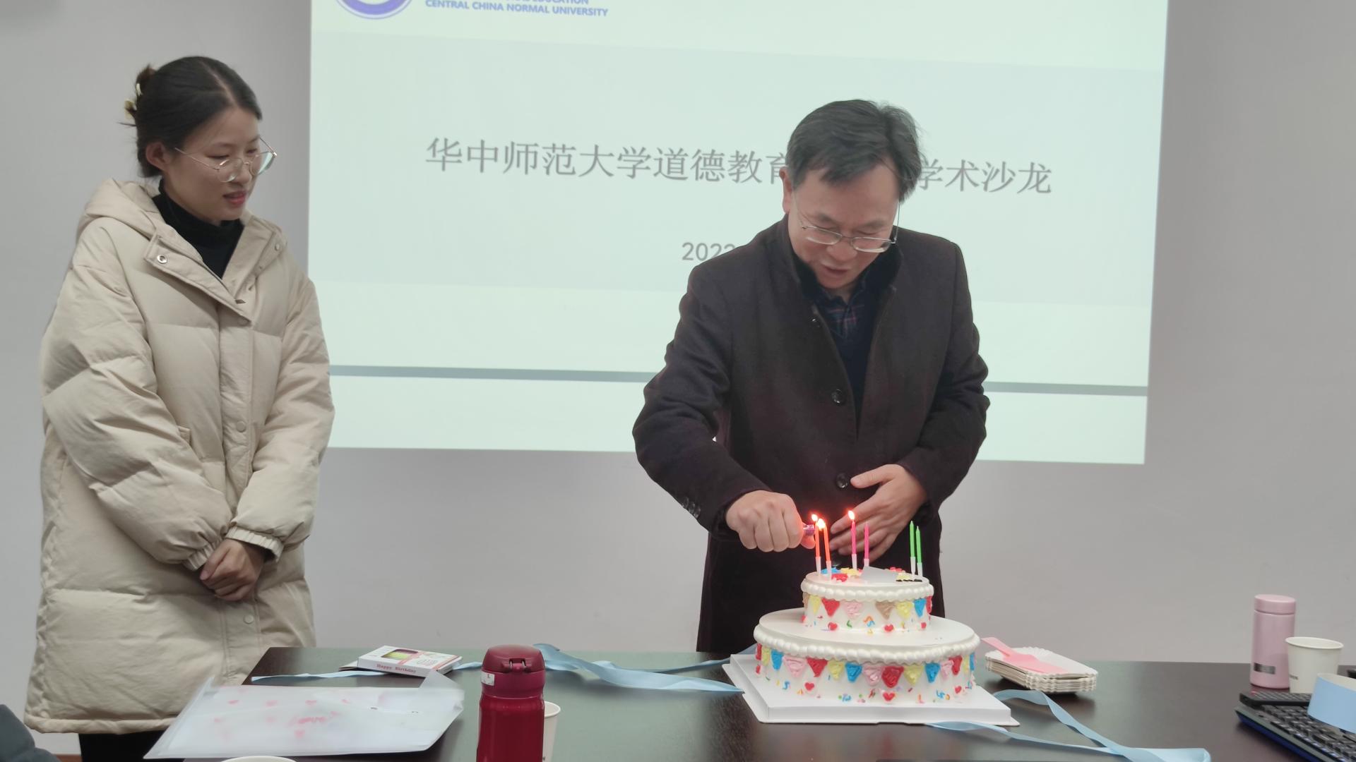 本期学术沙龙有三项议程:一是杜时忠教授论文分享:《道德从何而来》;二是博士生何婧读书分享:《去学校化社会》;三是师生共庆生日。