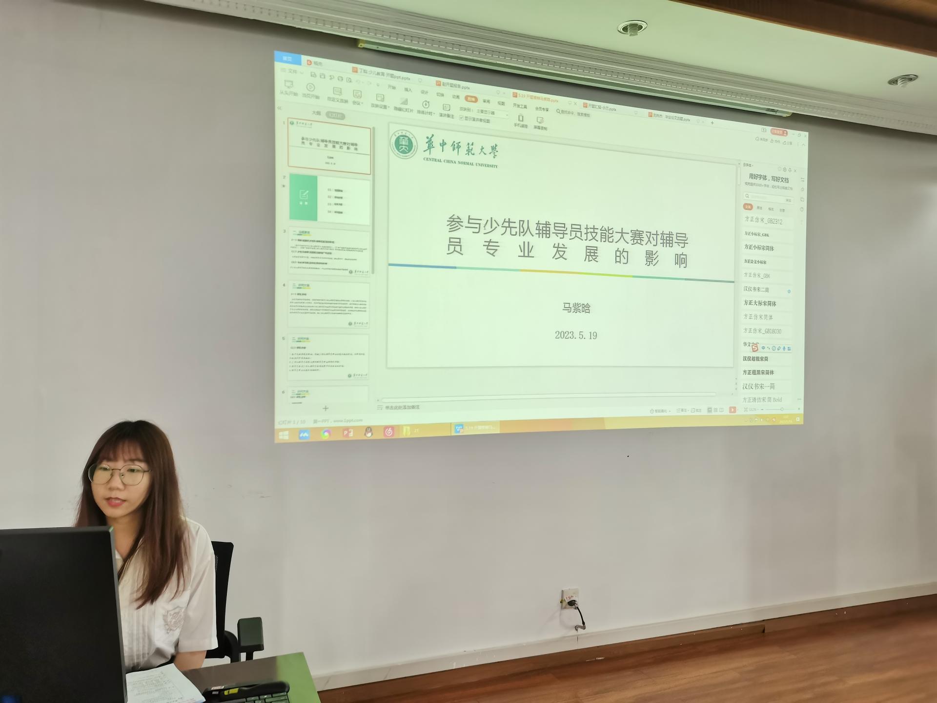 马紫晗从选题缘由、研究方案、论文大纲和研究困惑四个方面进行汇报。首先,她阐述了少先队辅导员和技能大赛的背景,并分享了专业学习经历中的思考和体悟。然后,她从研究目的、研究内容、研究方法和研究计划上说明了研究方案,明确了访谈这一调查方法。接着,她展示了论文大纲,并在最后从专业素养的划分维度、访谈提纲编制、访谈人员、论文大纲四个方面提出了研究困惑。