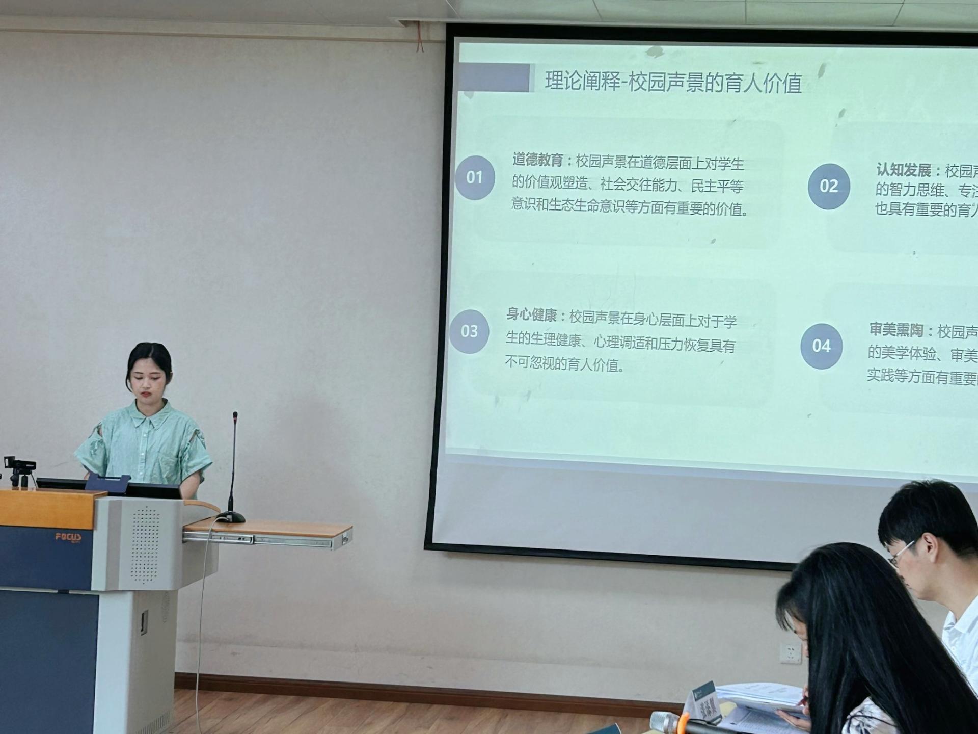 针对高一蓝的硕士论文,答辩委员会进行了评价与提问。孙银光副教授认为在具体框架内容的理论依据上需要完善。并提出问题:一是大中小学声景育人定位的差异是什么?二是声景育人是正向的还是负向的?卢旭副教授指出部分标题需进一步优化,并提出问题:声音舒适是否是育人的必要条件?程红艳教授指出在原因分析方面,对校园的文化生态的分析不足,建设路径缺乏生态校园的意识,并提出问题:小学噪音的状态怎样才被视为是合理的?刘长海教授指出本文选题新颖,但声音可从政治、社会性角度进行分析,从声音视角发现一些更加深入的现象以进行深度调查研究。