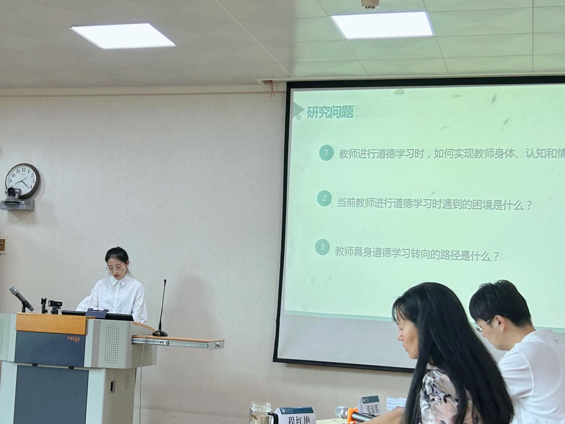 裴玲丽以研究问题、研究方法与过程、研究反思等方面对论文进行了汇报。她通过访谈法搜集不同学段和地区的教师资料,检视了具身认知视域下教师道德学习的现状,发现了其中的困境,并分析了成因。基于此,她对教师道德学习的路径进行了探索。