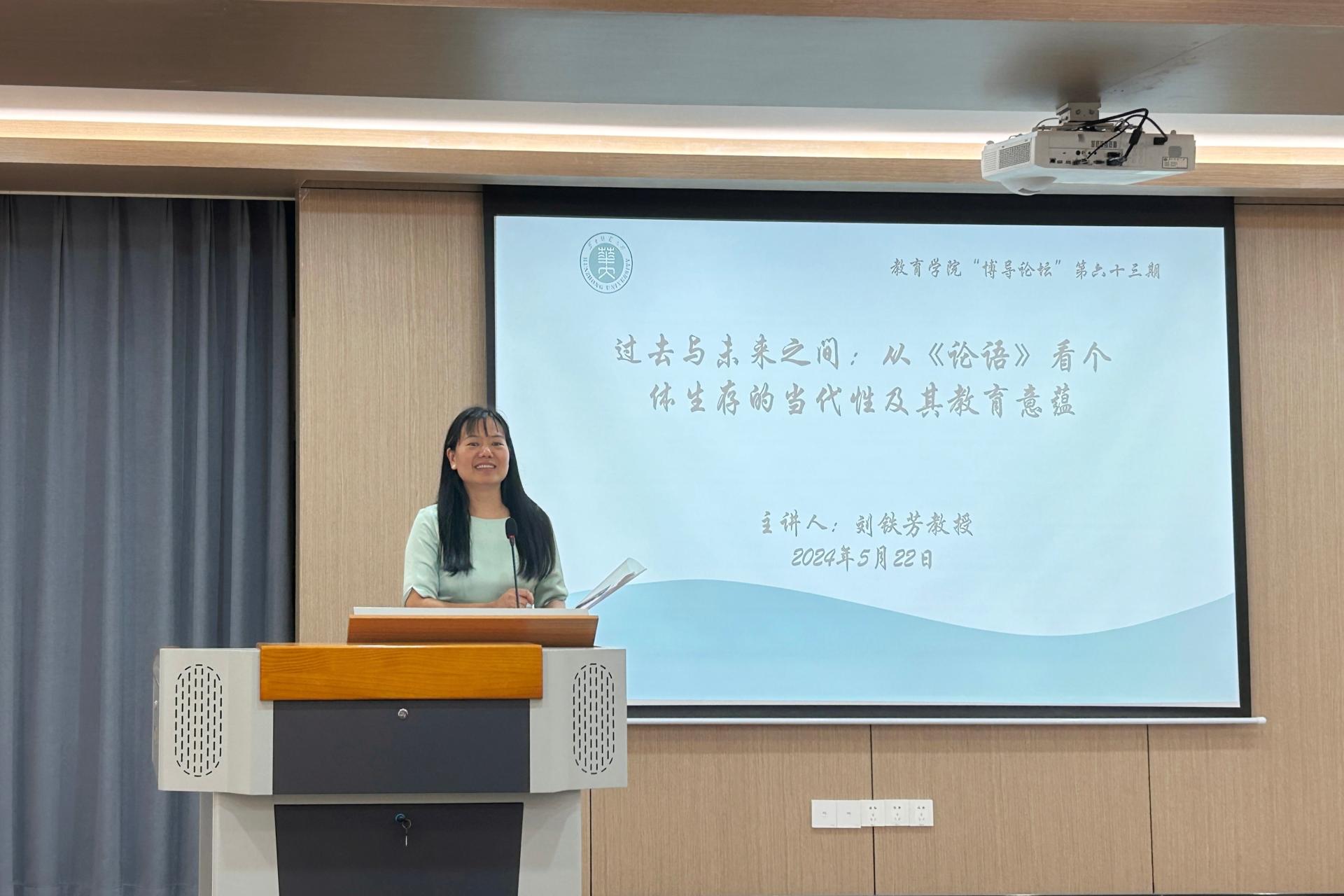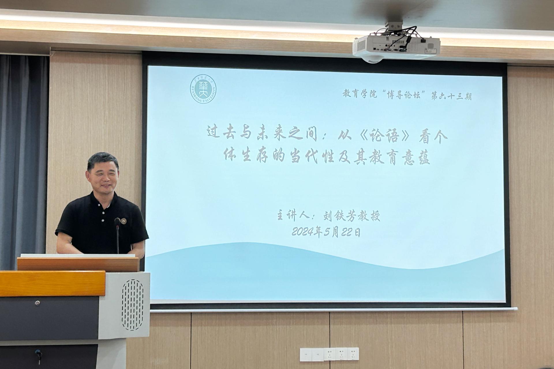 2024年5月21日,教育学院于田家炳楼601教室成功举办了“博导论坛”系列讲座第六十三期,由刘铁芳教授主讲,主题为“过去与未来之间——从《论语》看个体生存的当代性及其教育意蕴”。讲座由程红艳教授主持,教育学院部分教师代表、硕博研究生参与。会场座无虚席,气氛热烈。