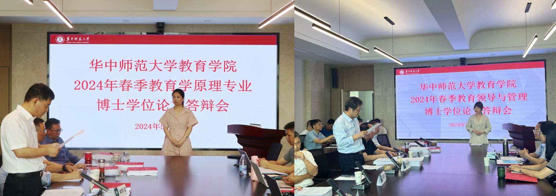 2024年5月22日,华中师范大学教育学院于田家炳楼901会议室举行了春季教育学原理专业、教育领导与管理专业博士毕业论文答辩会。教育学原理专业答辩会邀请了湖南师范大学刘铁芳教授作为答辩委员会主席、教育领导与管理专业答辩会邀请了华中科技大学李太平教授和湖北大学靖国平教授担任答辩委员会主席,华中师范大学涂艳国教授、杜时忠教授、程红艳教授、岳伟教授、田友谊教授任答辩委员,校内外数十名师生旁听参加。