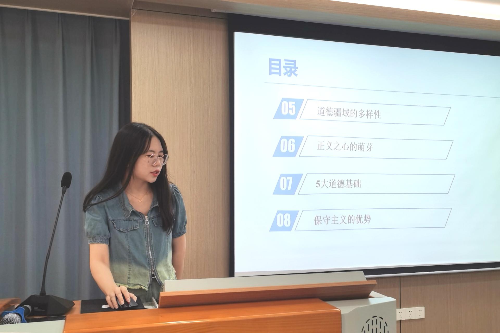 硕士生陈宇哲分享道德心理学的第一原则:直觉在先,策略性推理在后。她就道德的起源、道德的两种认知过程、道德认知的六大发现和追求选票的政客等方面进行了阐述。