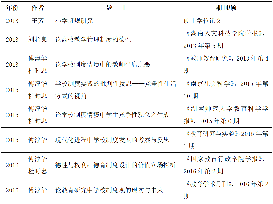 首先看制度生活。虽然制度生活在期刊的首次亮相并没有引起学界注意,但这并不影响我们团队继续对它展开研究。先是程红艳教授在2013年发表《学生制度生活与学校公共领域的创生》一文,接着同年两篇博士学位论文答辩,分别是刘任丰的《学校制度生活的个案研究》,以及张敏的《学校制度生活理论研究》,再之后2014年又一篇博士学位论文,傅淳华的《学校制度生活研究》参加答辩。这一批论文的写作,反映了我们团队对“制度生活”的重视。这几篇论文,分别从不同的角度做出了不同的贡献。