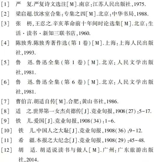 1904年,胡适前往上海求学,对严复和梁启超予以了极大关注。胡适说梁启超的《新民说》把自己“震醒出来,它们开了给我,也就好像开了给几千几百别的人一样,对于世界整个的新眼界”[7](P89)。