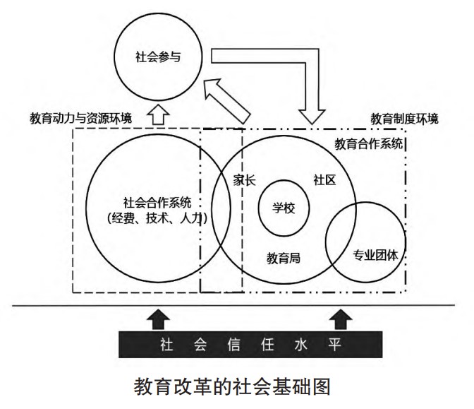 社会信任是合作发生的文化土壤,为广泛的社会合作提供心理准备;社会参与是合作的制度渠道,使得合作行动的成果能够合法化、制度化,对实践产生影响。因此,以社会合作为中心,社会信任、社会参与联合起来为教育改革提供了从心理准备到实际行动、从行动到制度化的社会基础。其一,社会信任是推行教育改革的社会心理基础。社会信任以及奠基于其上的社会诚信水平影响了教育改革的成本和风险。在信任度较低的社会环境中,教育改革难以实施,并且理想化的制度改革在实施中往往也会被扭曲,使得教育改革完全背离初衷。其二,社会合作为教育改革提供了多维动力机制。社会多元主体之间的合作为教育改革提供资源和动力,使得教育改革突破政府为主导的单一改革,从独奏变成合奏,进而在合作的去中心化的社会网络节点中自发地产生教育创新。其三,社会参与为教育改革制度创新提供了可能性。社会参与使教育利益相关者通过与教育管理者、政策制定者之间的博弈,将合理的教育诉求从意见、建议、理念变为合法化的制度,从而影响教育改革走向。