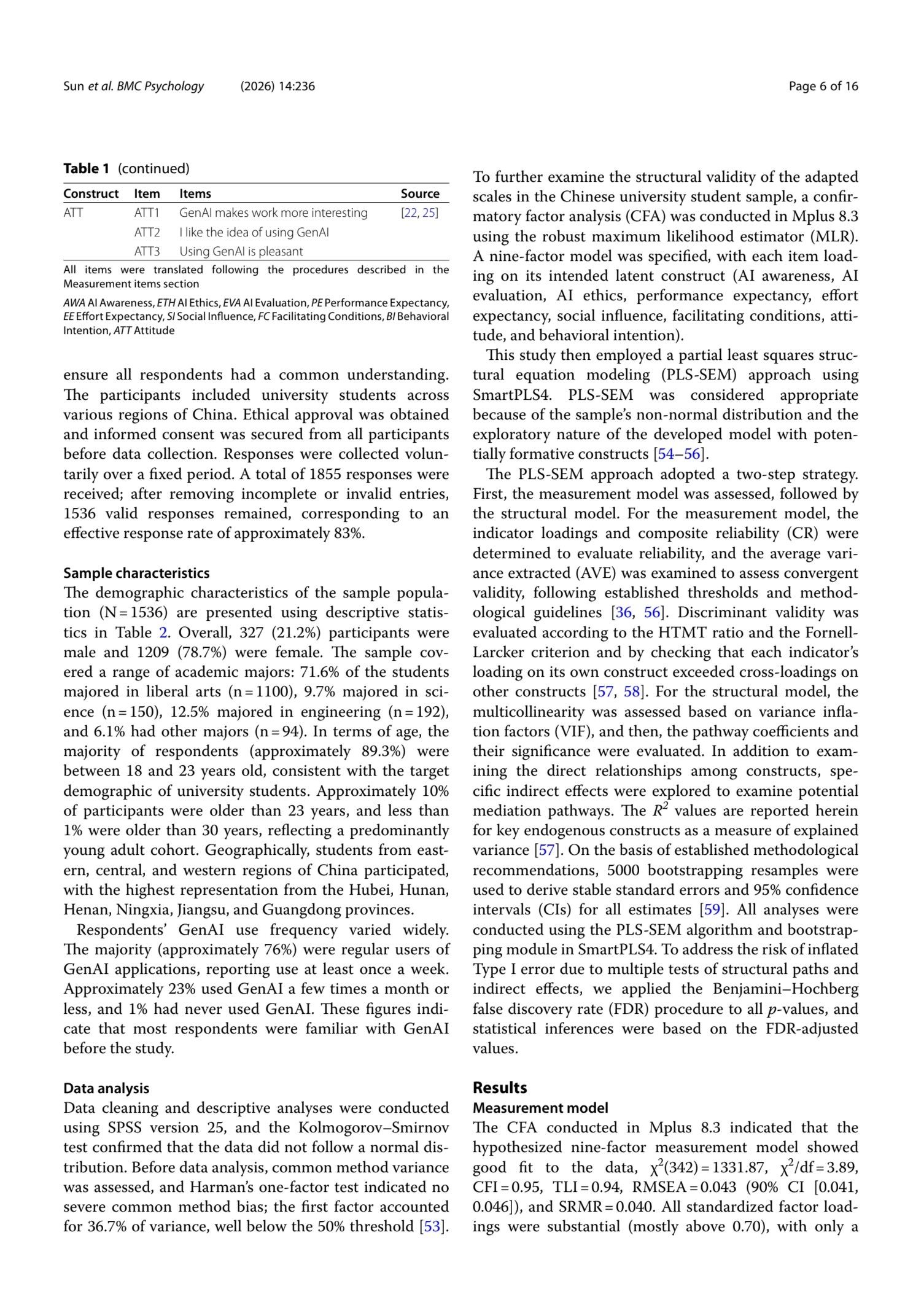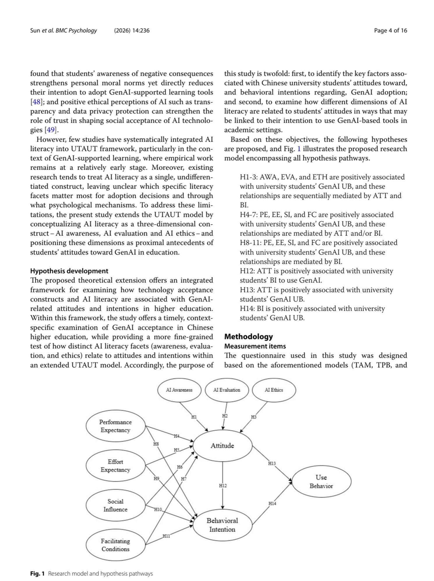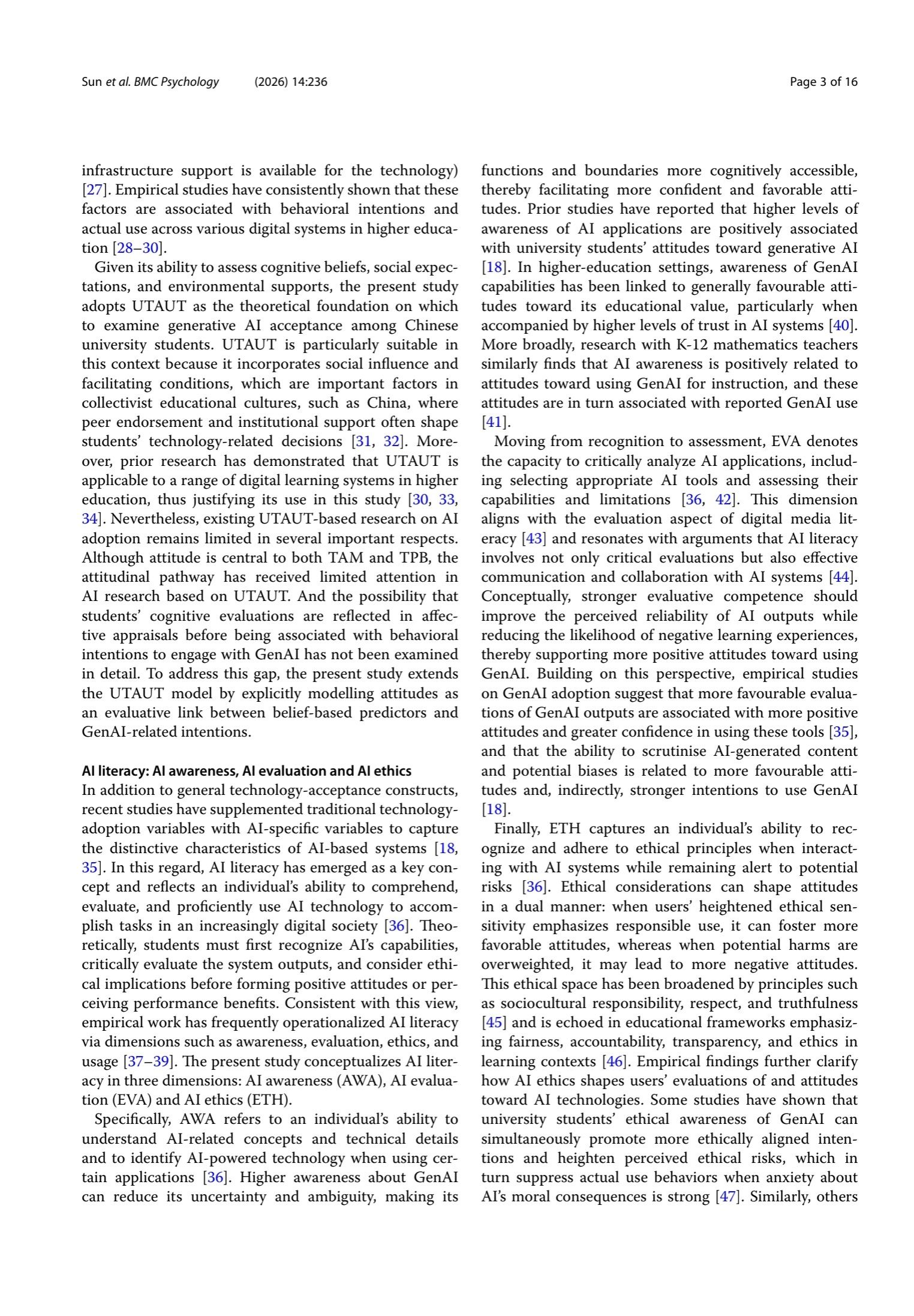 Method A cross-sectional survey design was employed. Data were collected from 1,536 Chinese university students via an online questionnaire. The instrument included validated scales measuring AI literacy (awareness, evaluation, ethics), UTAUT constructs (performance expectancy, effort expectancy, social influence, facilitating conditions), attitude, behavioral intention, and use behavior. Partial least squares structural equation modeling (PLS-SEM) was used to test the hypothesized relationships.