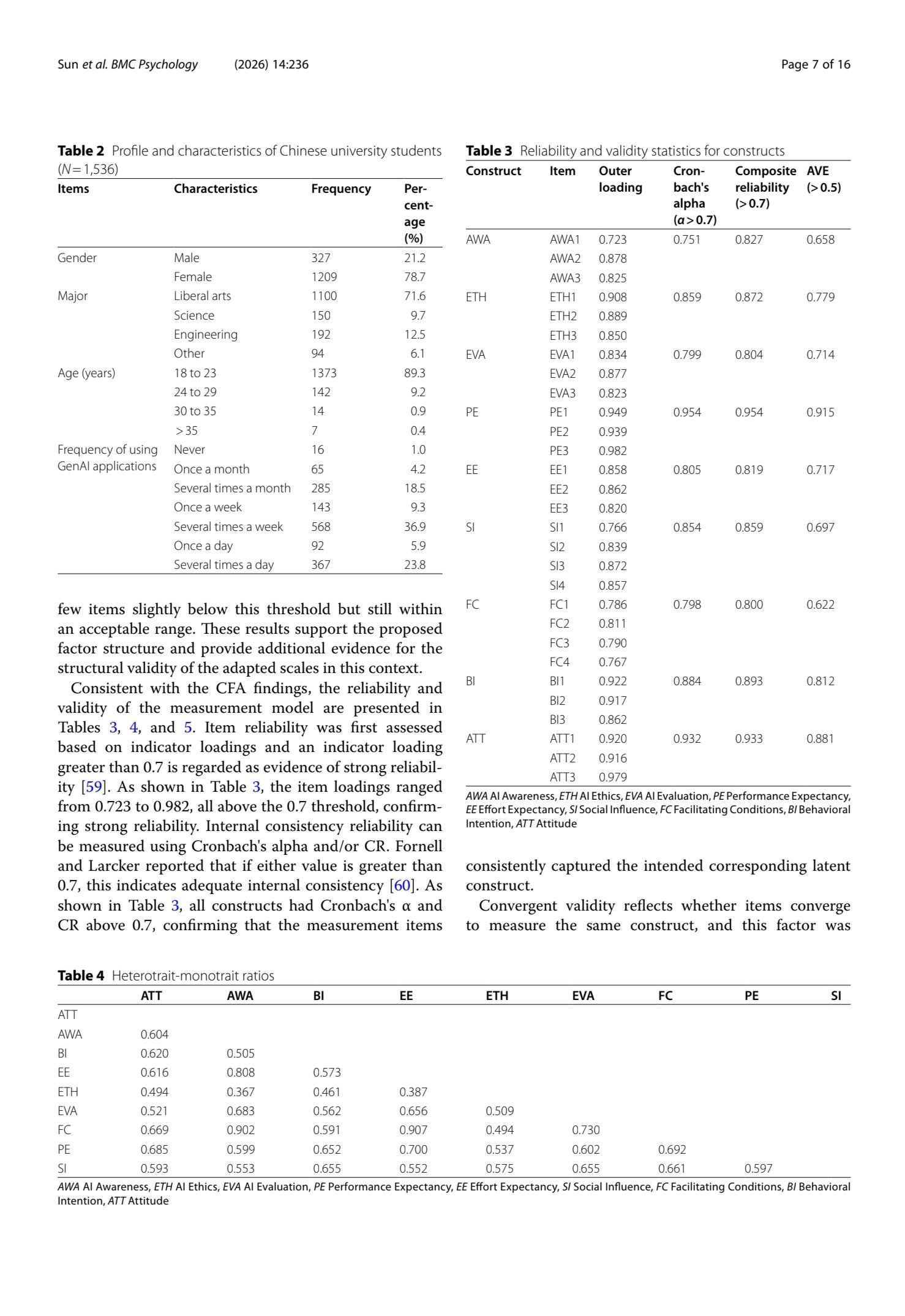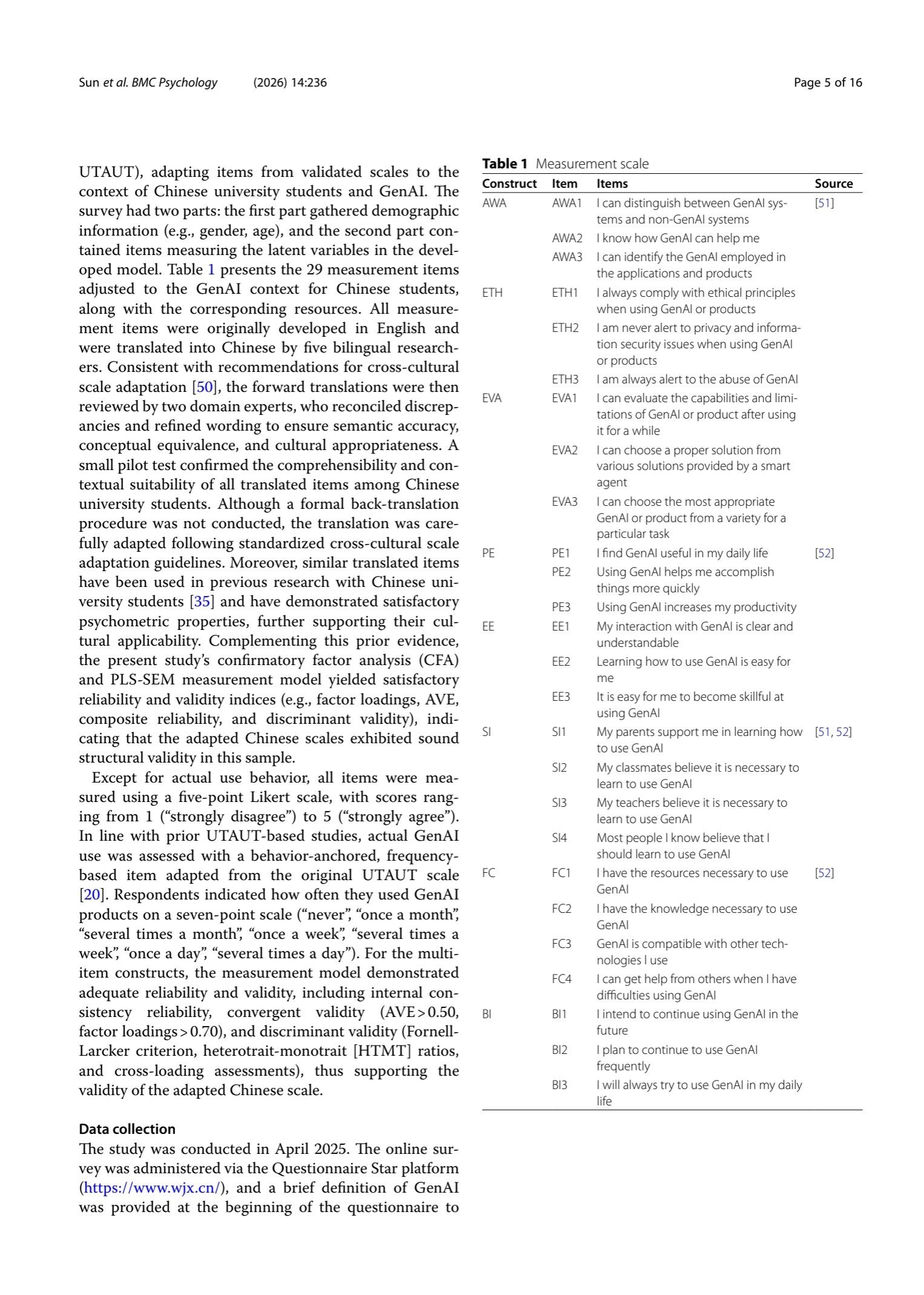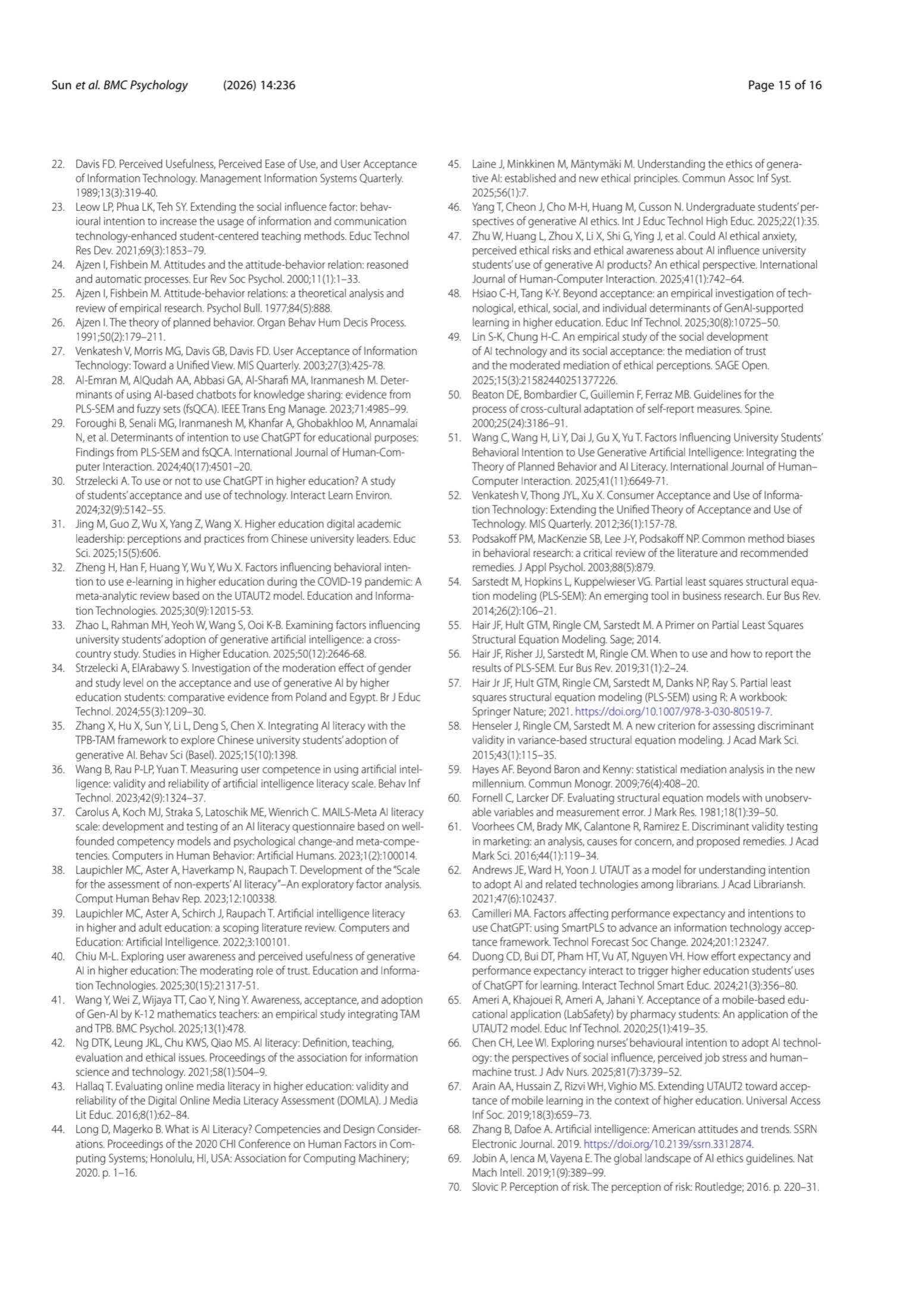 Method A cross-sectional survey design was employed. Data were collected from 1,536 Chinese university students via an online questionnaire. The instrument included validated scales measuring AI literacy (awareness, evaluation, ethics), UTAUT constructs (performance expectancy, effort expectancy, social influence, facilitating conditions), attitude, behavioral intention, and use behavior. Partial least squares structural equation modeling (PLS-SEM) was used to test the hypothesized relationships.