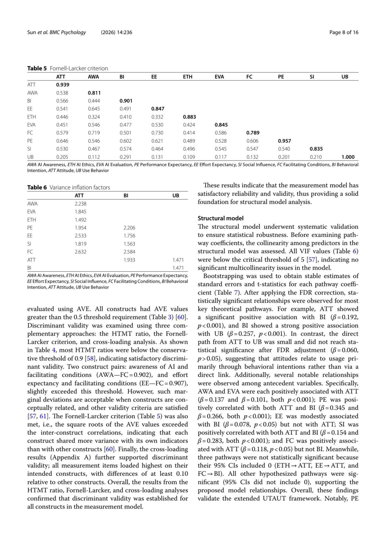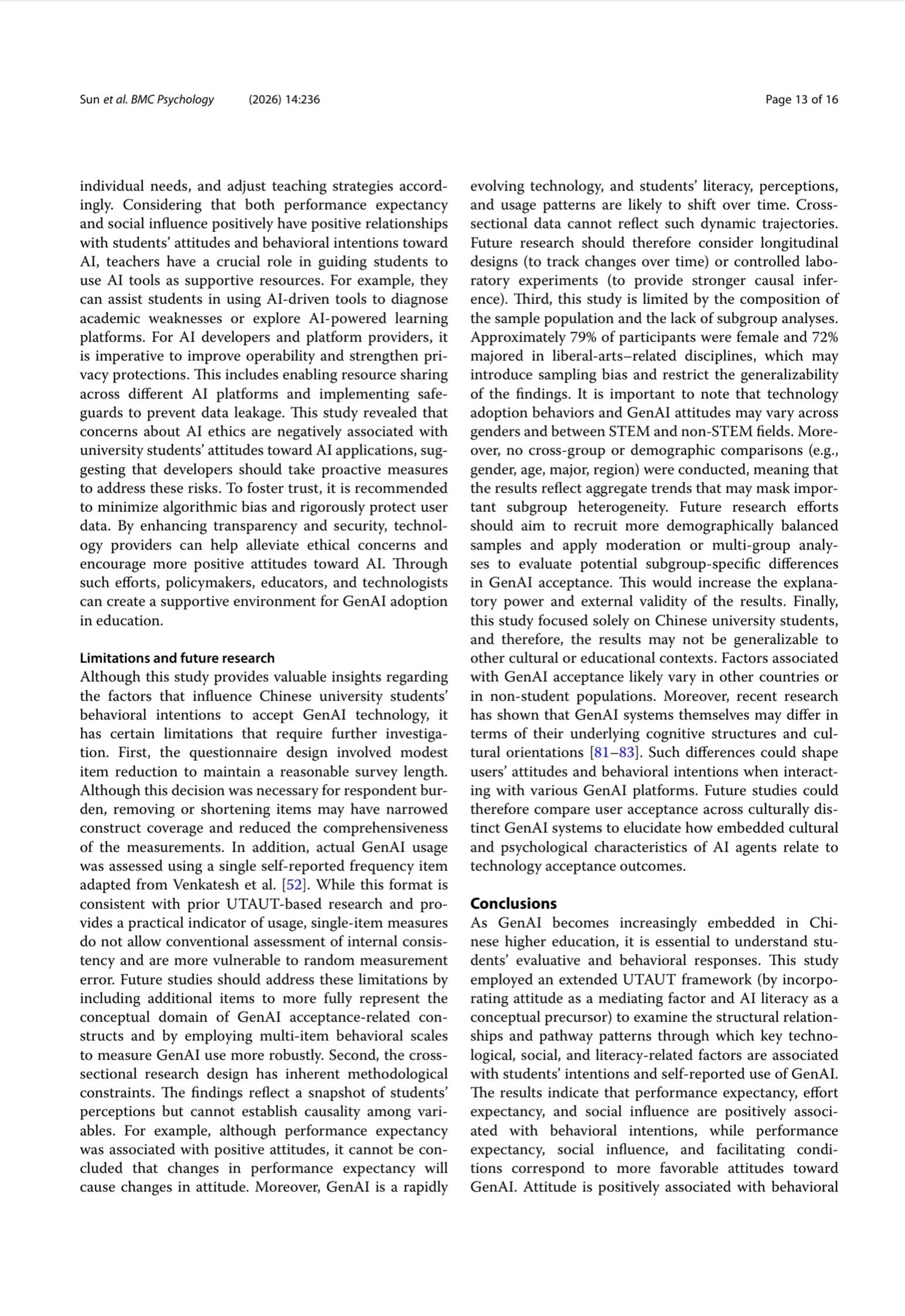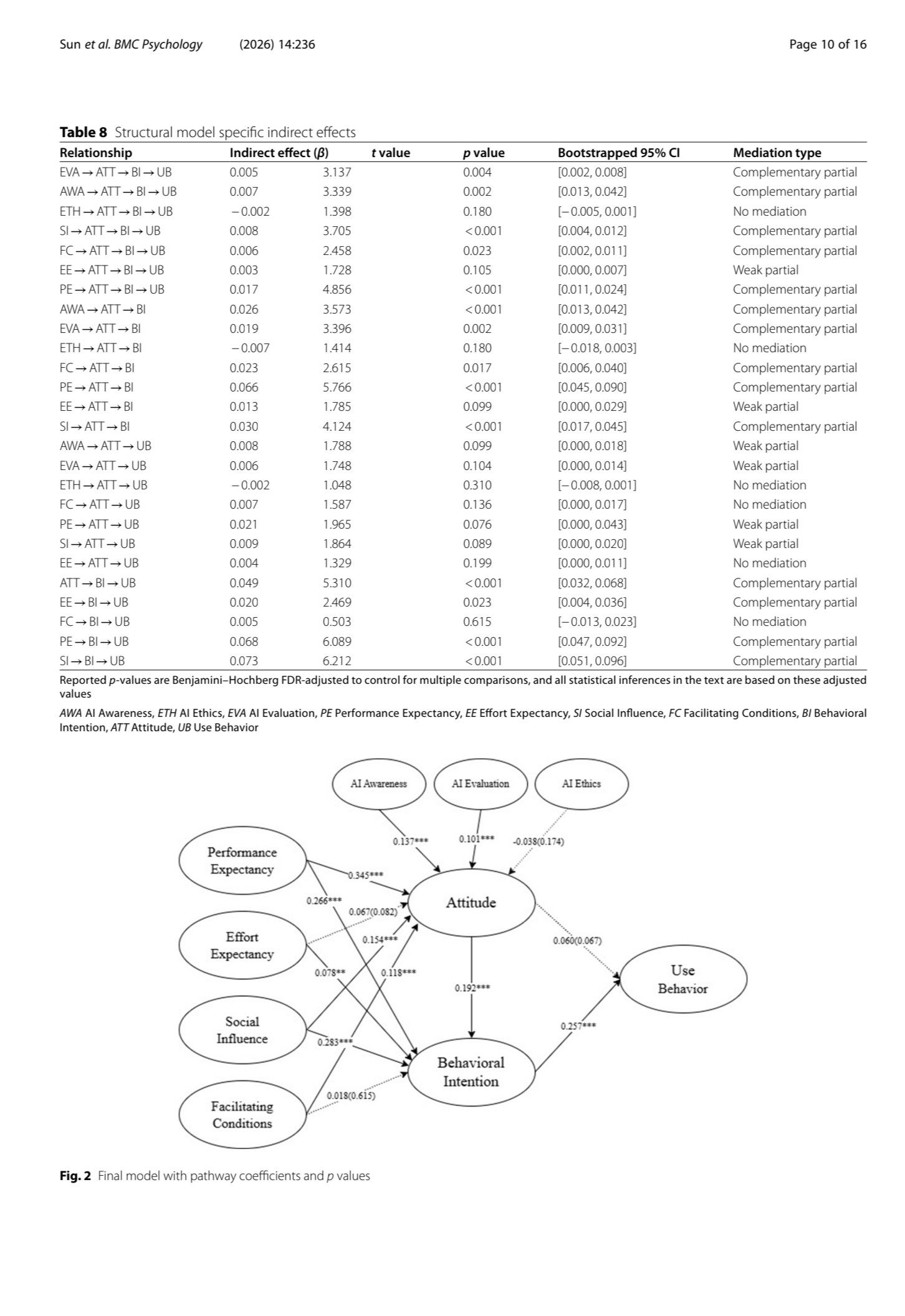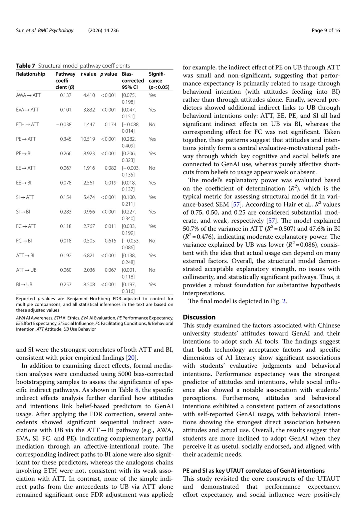 Results Performance expectancy (β = 0.345, p < 0.001), social influence (β = 0.154, p < 0.001), and facilitating conditions (β = 0.118, p < 0.05) were positively correlated with students’ attitudes toward GenAI. Performance expectancy (β = 0.266, p < 0.001), effort expectancy (β = 0.078, p < 0.05), and social influence (β = 0.283, p < 0.001) were linked to behavioral intention. Attitude was positively associated with behavioral intention (β = 0.192, p < 0.001), whereas its direct association with use behavior was small and non-significant after FDR correction (β = 0.060, p > 0.05); instead, behavioral intention showed a strong positive association with use behavior (β = 0.257, p < 0.001). Among AI literacy dimensions, awareness (β = 0.137, p < 0.001) and evaluation (β = 0.101, p < 0.001) were positively associated with attitudes, while ethics demonstrated a non-significant negative relationship (β = − 0.038, p = 0.148). The model explained 50.7% of the variance in attitude and 47.6% in behavioral intention.