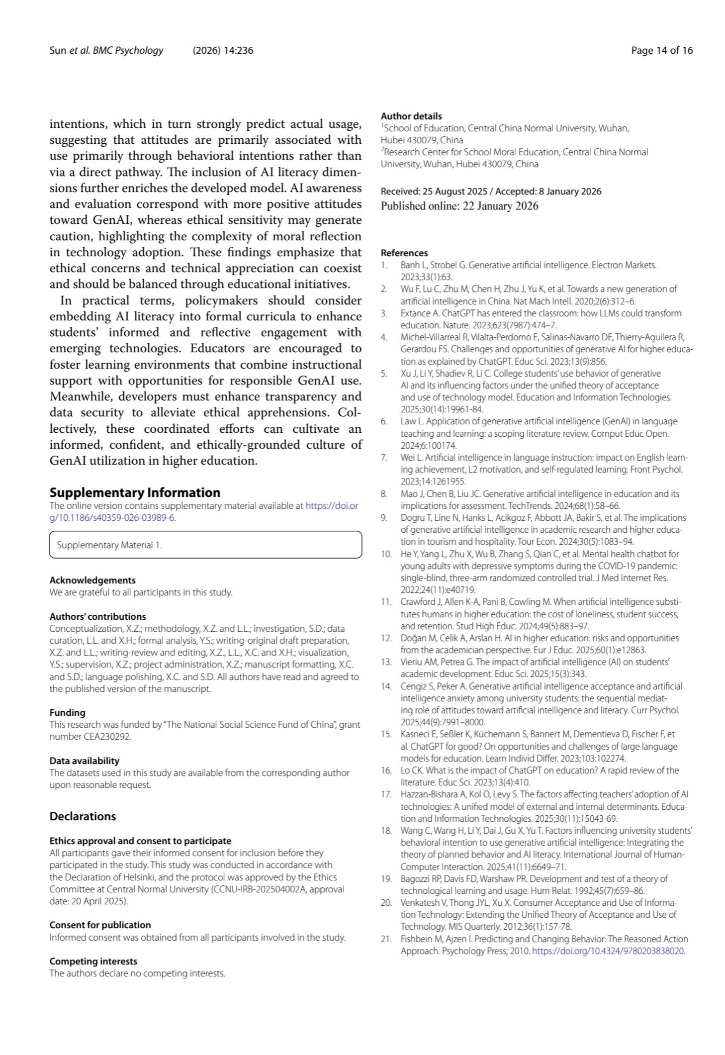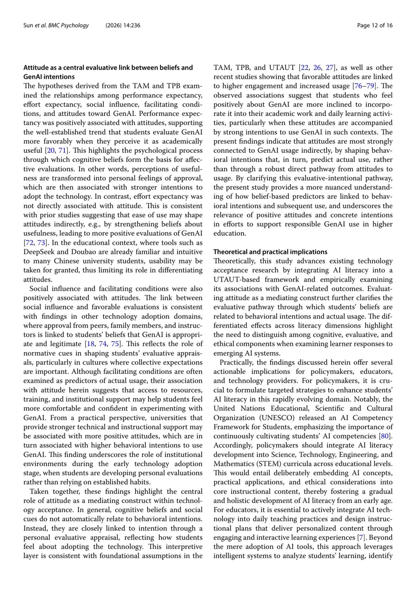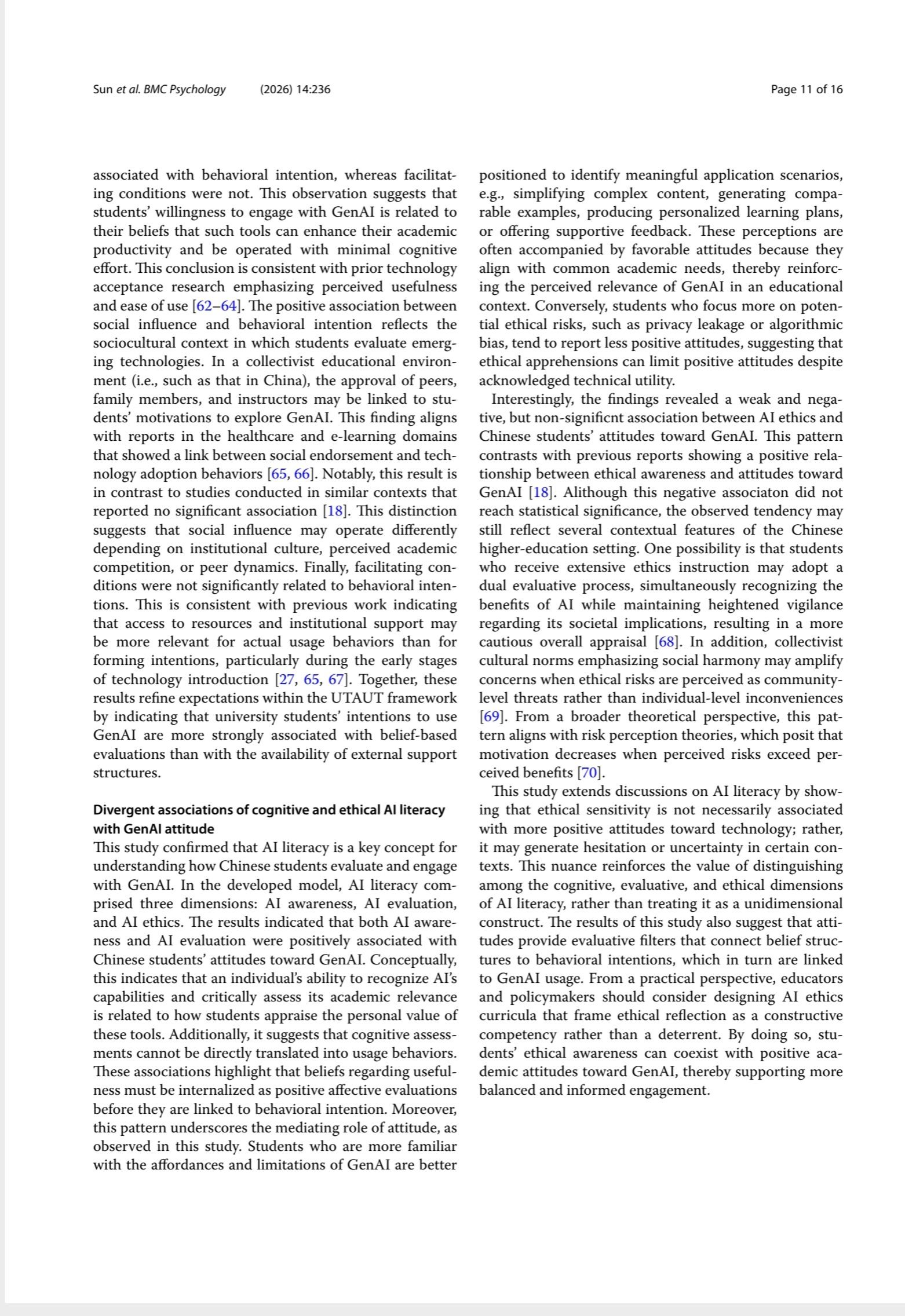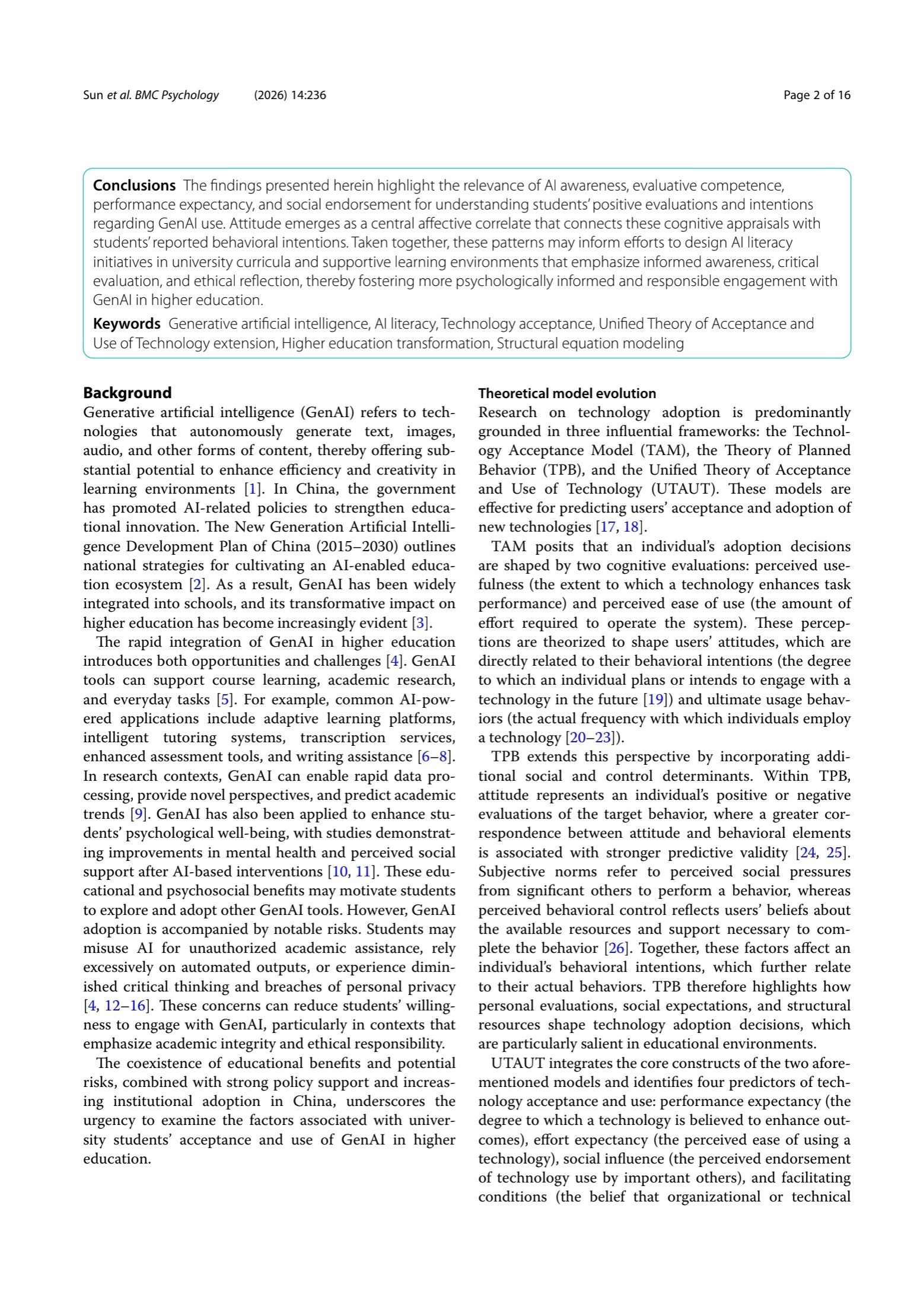 Conclusions The findings presented herein highlight the relevance of AI awareness, evaluative competence, performance expectancy, and social endorsement for understanding students’ positive evaluations and intentions regarding GenAI use. Attitude emerges as a central affective correlate that connects these cognitive appraisals with students’ reported behavioral intentions. Taken together, these patterns may inform efforts to design AI literacy initiatives in university curricula and supportive learning environments that emphasize informed awareness, critical evaluation, and ethical reflection, thereby fostering more psychologically informed and responsible engagement with GenAI in higher education.
