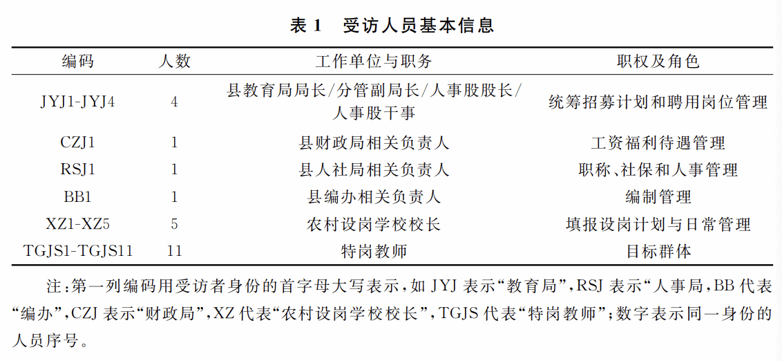 本文运用上述模型,从中部省份选取实施“特岗计划”的样本县(以下简称 “特岗县”)进行系统化分析,探究“特岗计划”执行主体、目标群体和政策环境之间的相互作用与张力对政策目标的影响,还原该县“特岗计划”实施的全过程。选取Z县为样本县,一是由于其是国家级贫困县,农村教师严重不足且老龄化严重;二是因为“特岗计划”一直是该县补充教师的主要渠道,比较有代表性。基于目的性抽样原则和滚雪球抽样原则,研究共形成23人样本(见下页表1)。为确保受访者的典型性与代表性,县教育局的受访对象基本覆盖了涉及”特岗计划”的相关工作人员,重点访谈了县人社局、编办和财政局相关负责人,受访农村设岗学校校长代表覆盖了农村九年一贯制学校、乡镇初级中学、乡镇中心小学、农村小规模学校和教学点,受访特岗教师代表分别自来这5类学校且入职年限涵盖1~5年,6~10年和11~15年三个阶段。研究人员还向10所农村设岗学校的106名特岗教师发放了调查问卷,收回有效问卷102份,回收率96.2%。调查数据的分析结果与访谈材料相互映证,以进一步提高研究的真实性与可靠性。