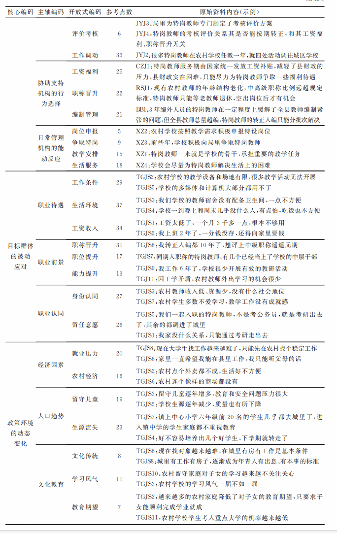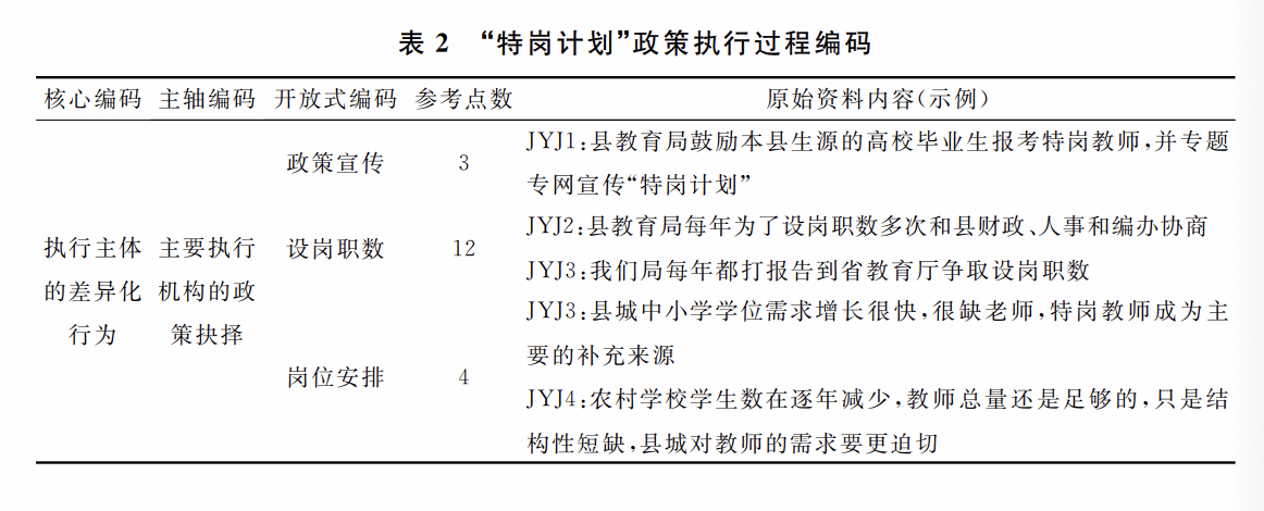 文章针对6类访谈对象分别制定访谈提纲,并根据预访谈的反馈情况和受访者的意见修改定稿。访谈主要围绕受访者对“特岗计划”的认识和态度,政策执行的条件与困难,以及政策执行过程中的具体做法三个方面展开。研究人员先后于2022年3月、2023年10月及2024年5月三次赴Z县,对相关人员进行深度访谈,每人次时长为50~90分钟。为保护受访者隐私,对访谈材料进行了匿名化处理。经受访者同意,对访谈内容进行了录音,共转录访谈材料28.4万字。研究人员借助Nvivo12.0软件进行归类与编码,开展类属分析,对访谈转录稿进行三级编码(见表2),并多次与受访者一起对编码的内容进行检测,验证编码系统是否准确反映了受访者的观点。研究同时采取访谈与编码分析交叉进行的方式推进,直到分析新的访谈材料已无法产生新概念,即概念达到饱和状态时即终止访谈。