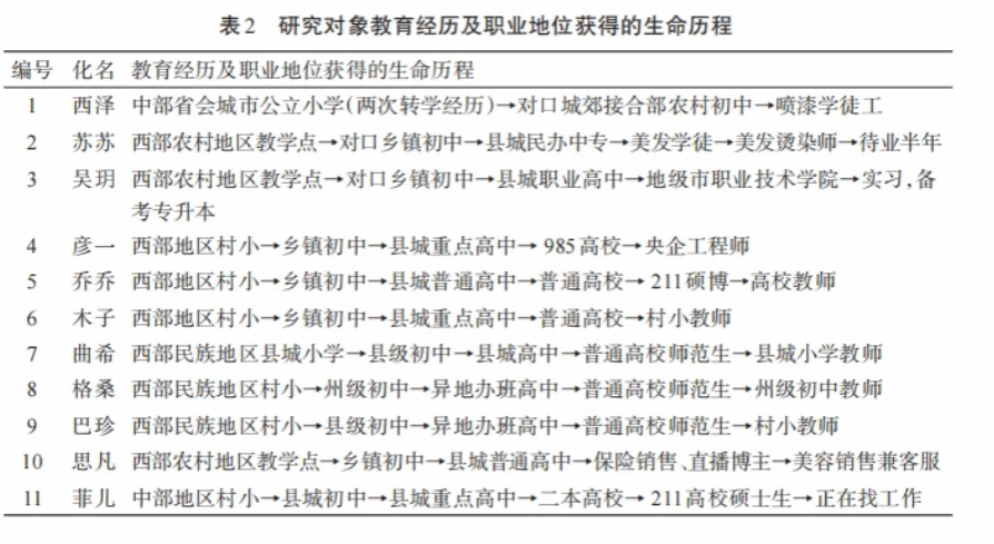 他们都有在教育资源匮乏、整体教学质量不佳学校就读的体验,在地理位置、家庭背景、就读学校等多方面有一定的劣势累积。对他们而言,冲破阶层壁垒、实现阶层流动,似乎比一般人更难,因为任何一项弱势都可能成为阻碍其流动的决定性障碍。他们之中也有人通过获得大学、研究生文凭而获得体面工作,某种程度上打破了束缚自身的枷锁,实现了阶层跃迁。为更直观地了解底层农家子弟的成长经历、教育机会、职业状况间的勾连,本研究从生命历程的角度进行了梳理(见表2)。