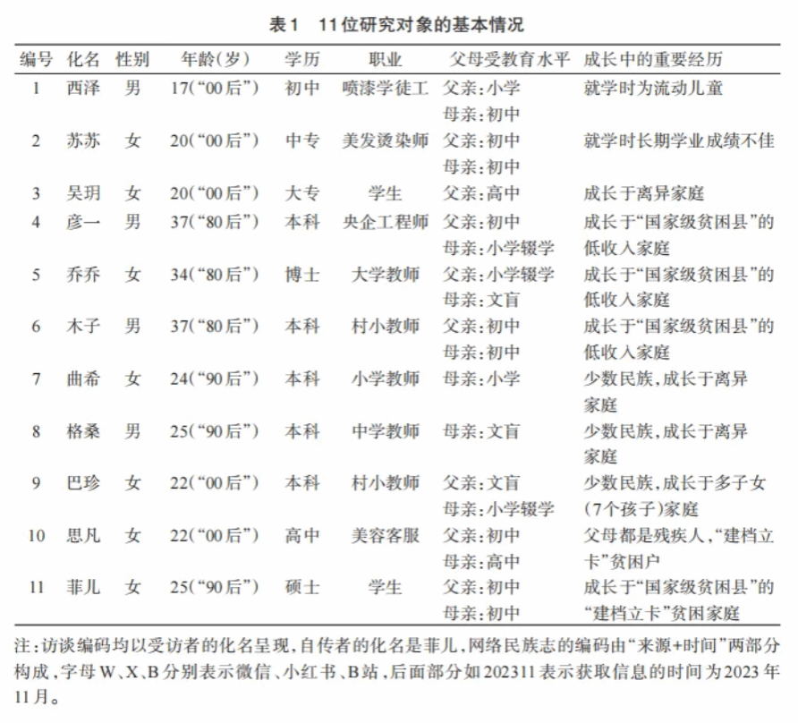 此外,现代通信技术的发展和网络的匿名化优势也为个体讲述故事、自我书写提供了空间。故本研究以网络民族志作为补充,在社交平台(知乎、豆瓣、小红书、微信、微博、B站)上进行关键词(底层群体、农家子弟、农村大学生、小镇做题家)搜索,以把握人们对底层农家子弟阶层流动的话语表达和意义建构,并邀请了1位底层农家子弟撰写自传,与访谈材料综合分析、相互印证,进一步弥补访谈未收集到的有效信息。为遵守研究伦理,本研究对收集到的资料(10 份访谈和 1 份自传,见表 1)进行编码处理。