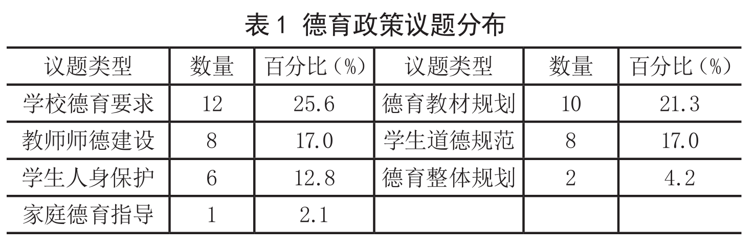 德育政策议题是德育政策制定意欲解决的德育问题。并不是所有的德育问题都会转换为德育政策议题,“教育问题向教育政策问题的转化受教育问题本身的影响范围、问题是否清晰可辨、问题的严重程度、问题影响因素、代价、问题是否具有导向性和是否可以被评估等因素的影响。”[16]21世纪以来的社会变革和教育发展为德育工作带来了诸多新问题与新挑战,相应变化充分地体现在德育政策的议题中。具体而言,21世纪以来的德育政策议题主要包括学校德育要求、德育教材规划、教师师德建设、学生道德规范、学生人身保护等七个方面(见表1)。其中,数量最多的为学校德育要求类政策议题,共有12项,占比25.6%;数量最少的为家庭德育指导类政策议题,只有1项,即教育部在2015年印发的《关于加强家庭教育工作的指导意见》。如果进行更加详细的划分,主要涉及思想政治教育、教师师德建设、心理健康教育、生命保护教育、德育环境营造、行为习惯养成、德育整体规划、法治教育、学生道德要求、传统文化教育、家长德育要求、法治教育、生态文明教育和劳动教育等多类议题。