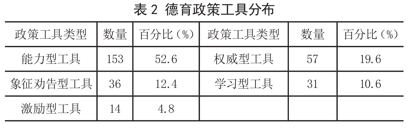 促使德育政策话语由“言说”转换为“实践”的关键在于是否拥有话语权。政策工具是政策话语权的重要体现。政策工具的选择及其配置,反映了政策话语权在政策实施中的具体运行状况。“政策工具即政府对标的群体运用权力,使其做出政府所希望出现的变化。”[17]因此,通过对德育政策工具的分析可以探究德育政策的话语效用。英格拉姆(Ingram)与施耐德(Schneider)将政策工具分为“权威型工具、激励型工具、能力建设型工具、学习型工具、象征劝告型工具”[18]五种类型。基于其政策工具分析框架,对47项德育政策进行规范性编码,共分析出291项政策工具(见表2)。