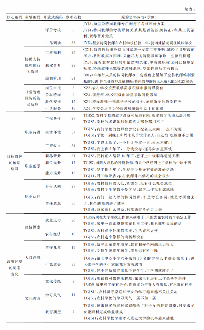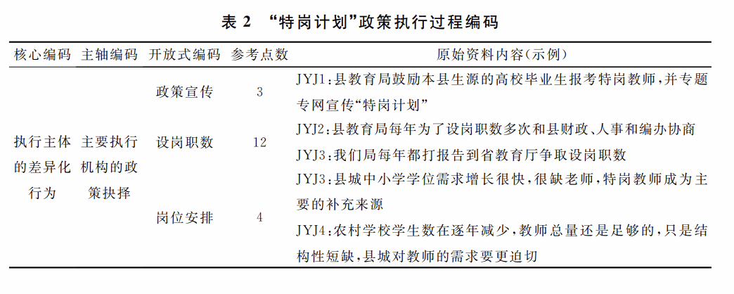 文章针对6类访谈对象分别制定访谈提纲,并根据预访谈的反馈情况和受访者的意见修改定稿。访谈主要围绕受访者对“特岗计划”的认识和态度,政策执行的条件与困难,以及政策执行过程中的具体做法三个方面展开。研究人员先后于2022年3月、2023年10月及2024年5月三次赴Z县,对相关人员进行深度访谈,每人次时长为50~90分钟。为保护受访者隐私,对访谈材料进行了匿名化处理。经受访者同意,对访谈内容进行了录音,共转录访谈材料28.4万字。研究人员借助Nvivo12.0软件进行归类与编码,开展类属分析,对访谈转录稿进行三级编码(见表2),并多次与受访者一起对编码的内容进行检测,验证编码系统是否准确反映了受访者的观点。研究同时采取访谈与编码分析交叉进行的方式推进,直到分析新的访谈材料已无法产生新概念,即概念达到饱和状态时即终止访谈。