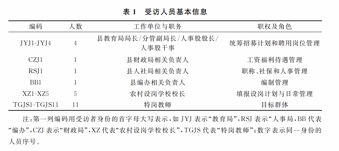 本文运用上述模型,从中部省份选取实施“特岗计划”的样本县(以下简称 “特岗县”)进行系统化分析,探究“特岗计划”执行主体、目标群体和政策环境之间的相互作用与张力对政策目标的影响,还原该县“特岗计划”实施的全过程。选取Z县为样本县,一是由于其是国家级贫困县,农村教师严重不足且老龄化严重;二是因为“特岗计划”一直是该县补充教师的主要渠道,比较有代表性。基于目的性抽样原则和滚雪球抽样原则,研究共形成23人样本(见下页表1)。为确保受访者的典型性与代表性,县教育局的受访对象基本覆盖了涉及”特岗计划”的相关工作人员,重点访谈了县人社局、编办和财政局相关负责人,受访农村设岗学校校长代表覆盖了农村九年一贯制学校、乡镇初级中学、乡镇中心小学、农村小规模学校和教学点,受访特岗教师代表分别自来这5类学校且入职年限涵盖1~5年,6~10年和11~15年三个阶段。研究人员还向10所农村设岗学校的106名特岗教师发放了调查问卷,收回有效问卷102份,回收率96.2%。调查数据的分析结果与访谈材料相互映证,以进一步提高研究的真实性与可靠性。