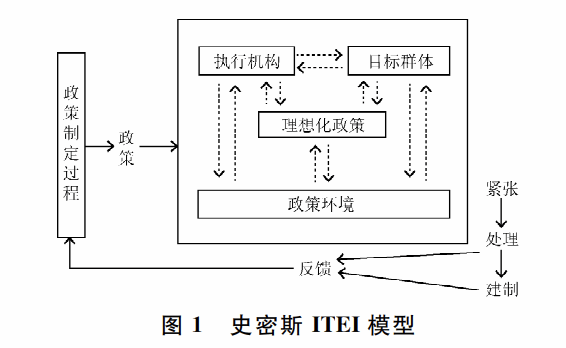 ITEI模型认为,新政策的执行在社会可能引发一种紧张关系,这种关系使得执行者和目标群体支持或拒绝进一步执行政策,政策执行效果通过反馈机制又影响政策制定过程。政策执行的过程实际上是在既定的环境因素下,执行机构与目标群体之间在目标和手段方面相互调适的动态平衡过程和双向的信息交流过程。其中,政策执行机构之间的合作与冲突、目标群体的价值取向与利益诉求、外部环境的文化制约和制度制约,使得政策执行过程充满复杂性和挑战[16]。具体地说,执行机关的结构和人员、主管领导的理解和态度、执行的能力与信心,目标群体的组织或反应,以及政策执行的经验,文化、社会经济与政治环境,均是政策执行过程中影响其成败的因素。