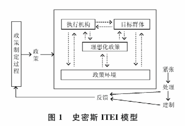 ITEI模型认为,新政策的执行在社会可能引发一种紧张关系,这种关系使得执行者和目标群体支持或拒绝进一步执行政策,政策执行效果通过反馈机制又影响政策制定过程。政策执行的过程实际上是在既定的环境因素下,执行机构与目标群体之间在目标和手段方面相互调适的动态平衡过程和双向的信息交流过程。其中,政策执行机构之间的合作与冲突、目标群体的价值取向与利益诉求、外部环境的文化制约和制度制约,使得政策执行过程充满复杂性和挑战[16]。具体地说,执行机关的结构和人员、主管领导的理解和态度、执行的能力与信心,目标群体的组织或反应,以及政策执行的经验,文化、社会经济与政治环境,均是政策执行过程中影响其成败的因素。