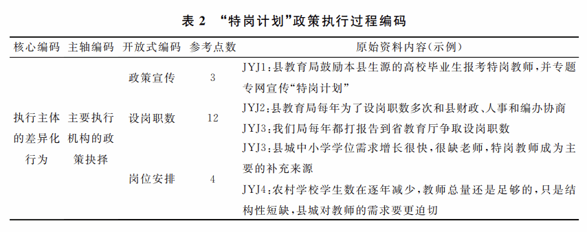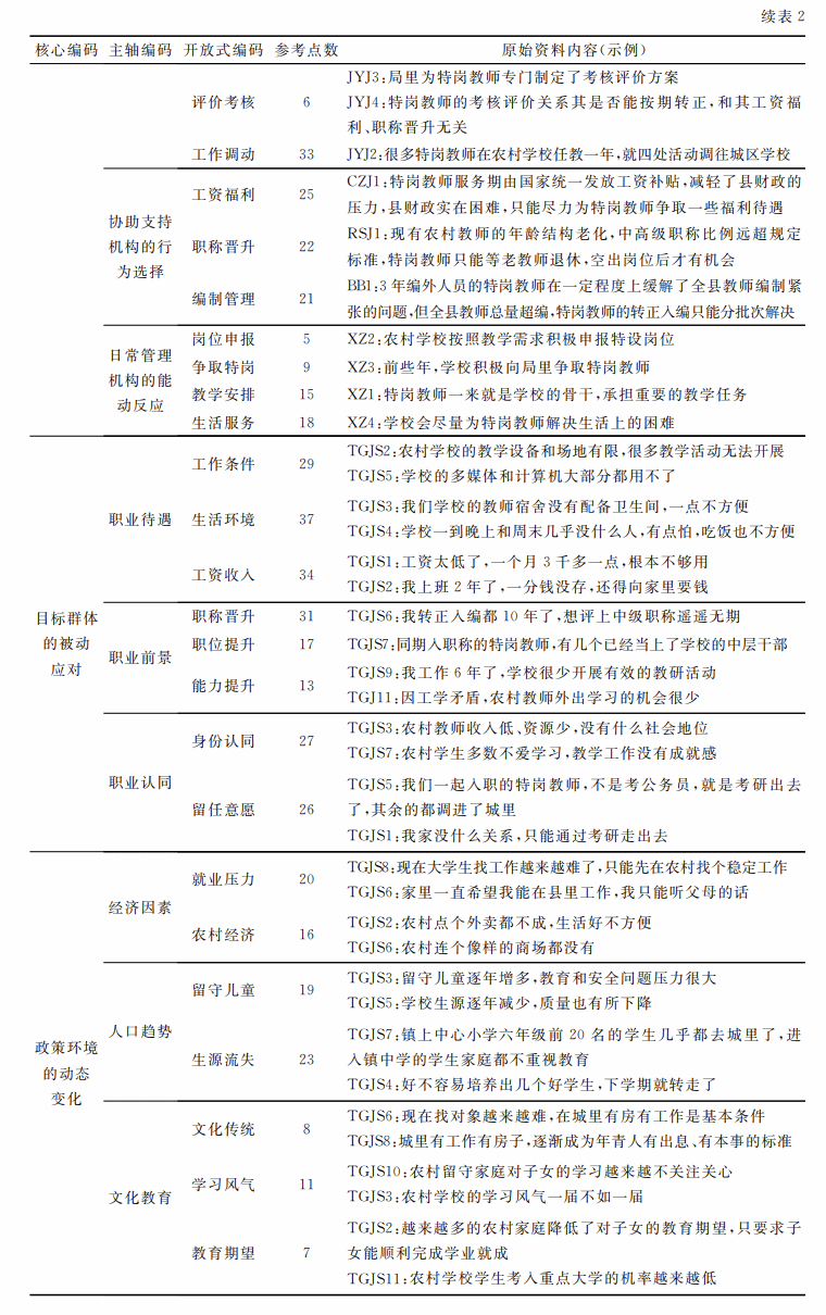 文章针对6类访谈对象分别制定访谈提纲,并根据预访谈的反馈情况和受访者的意见修改定稿。访谈主要围绕受访者对“特岗计划”的认识和态度,政策执行的条件与困难,以及政策执行过程中的具体做法三个方面展开。研究人员先后于2022年3月、2023年10月及2024年5月三次赴Z县,对相关人员进行深度访谈,每人次时长为50~90分钟。为保护受访者隐私,对访谈材料进行了匿名化处理。经受访者同意,对访谈内容进行了录音,共转录访谈材料28.4万字。研究人员借助Nvivo12.0软件进行归类与编码,开展类属分析,对访谈转录稿进行三级编码(见表2),并多次与受访者一起对编码的内容进行检测,验证编码系统是否准确反映了受访者的观点。研究同时采取访谈与编码分析交叉进行的方式推进,直到分析新的访谈材料已无法产生新概念,即概念达到饱和状态时即终止访谈。