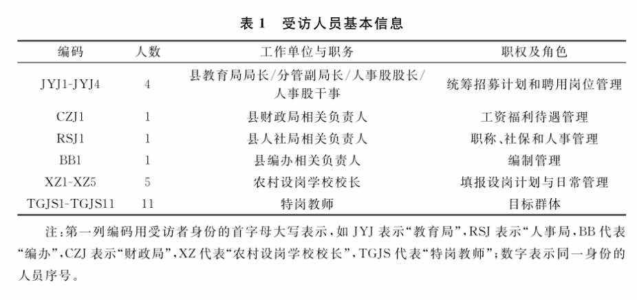 本文运用上述模型,从中部省份选取实施“特岗计划”的样本县(以下简称 “特岗县”)进行系统化分析,探究“特岗计划”执行主体、目标群体和政策环境之间的相互作用与张力对政策目标的影响,还原该县“特岗计划”实施的全过程。选取Z县为样本县,一是由于其是国家级贫困县,农村教师严重不足且老龄化严重;二是因为“特岗计划”一直是该县补充教师的主要渠道,比较有代表性。基于目的性抽样原则和滚雪球抽样原则,研究共形成23人样本(见下页表1)。为确保受访者的典型性与代表性,县教育局的受访对象基本覆盖了涉及”特岗计划”的相关工作人员,重点访谈了县人社局、编办和财政局相关负责人,受访农村设岗学校校长代表覆盖了农村九年一贯制学校、乡镇初级中学、乡镇中心小学、农村小规模学校和教学点,受访特岗教师代表分别自来这5类学校且入职年限涵盖1~5年,6~10年和11~15年三个阶段。研究人员还向10所农村设岗学校的106名特岗教师发放了调查问卷,收回有效问卷102份,回收率96.2%。调查数据的分析结果与访谈材料相互映证,以进一步提高研究的真实性与可靠性。