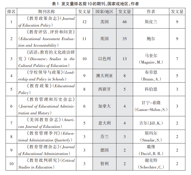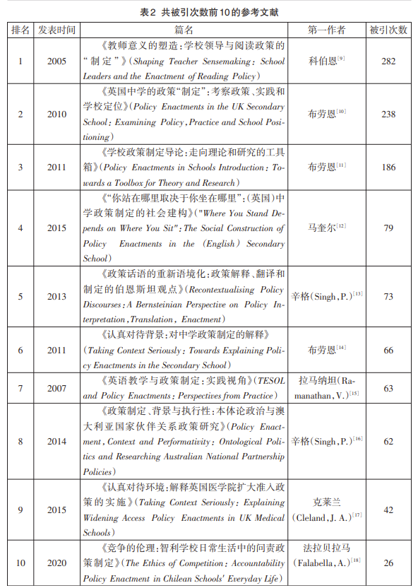 第三,在发文作者方面,参与教育“政策制定”研究的作者共227位,表1统计了发文量排名前10的作者。其中,并列排名首位的詹姆斯·斯皮兰(James Spillane)与斯提芬·鲍尔(Stephen Ball)分别来自美国西北大学与英国伦敦大学教育学院,而从其发表文献亦可看出两国教育政策执行研究的差异,前者侧重行为主体意义建构,后者强调社会学视角的批判分析。