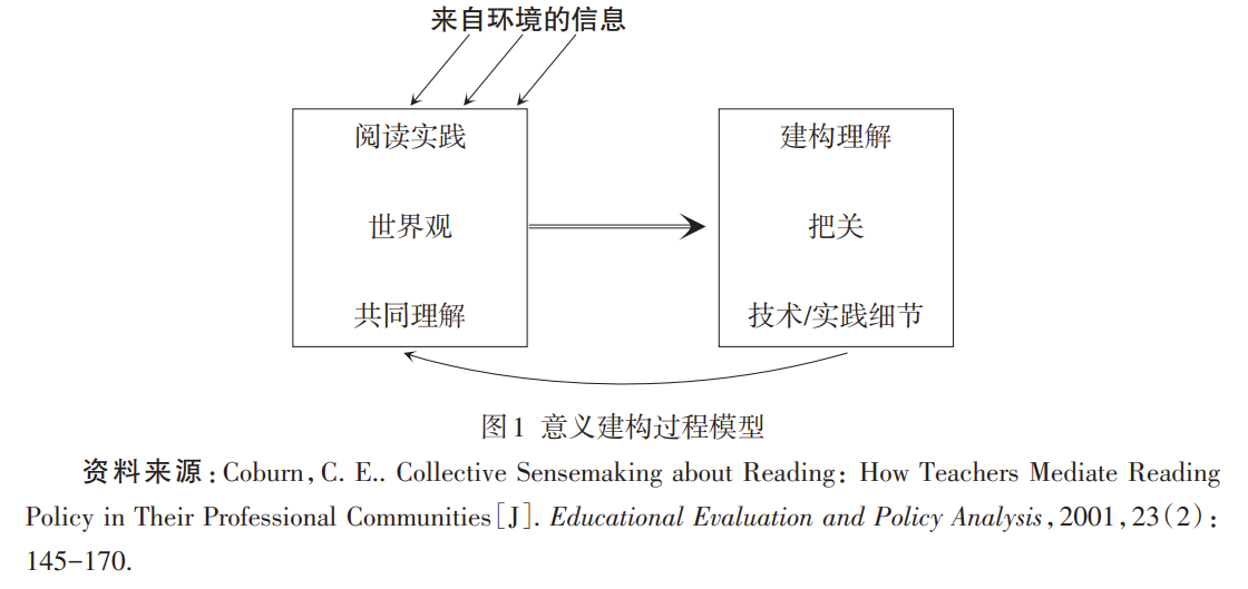 两类政策研究者都吸纳“意义建构”(sense-making)理论,旨在诠释抽象政策理念转化为情境化实践的纵向“制定”变迁过程。意义建构是社会行动者以先前知识为基础,努力理解组织中的混沌情况(circumstance),并将其渐而转为明确、可行情境(situation)的过程。[35]卡尔·维克(Karl Weick)将之划为创造(creation)、解释(interpretation)、制定(enactment)三个相互衔接的过程。[36]首先,个人通过搜集各方数据来探索更广泛的系统,以理解陌生、混乱的新情境;其次,借由对混沌情境的多重解释,个人将其所创造的初始感觉进化为更立体、更清晰的感知;最后,个人将知识转为行动,即根据所创造的解释来引导行动。行动者采用阅读、写作等途径对政策信息加以创造性解释,终使之清晰、可行的过程便是在践履意义建构,而这即为行动者“制定”政策的关键一环,进而两类政策研究者便皆依上阶段特征来审视“制定”状况。研究者指出,学校领导(校长、中层领导者)“意义建构”教育改革政策分为理解政策要求、组织政策学习与推动集体行动三个阶段。领导者先是收集政策目标的信息,并对其加以解释;再是在政策要求与学校内部目标互动中,深化对政策的意义认知;终经促动集体共同理解的构建以合法化政策执行。[37-43]