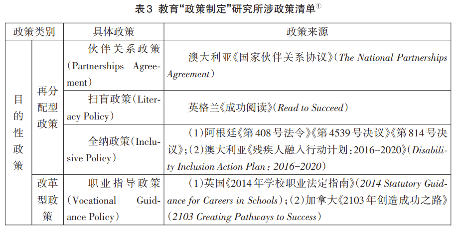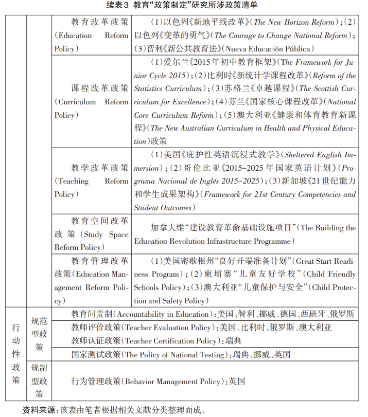 因人们对社会本质、权力意义和政府合理角色哲学理解上的冲突,政治科学发展为高度分化的学科领域,不同阵营理解政策的角度不同,渐而致使政策概念纷繁多样。[19]美国学者伊根·古巴(Egon Guba)概括出关于政策的八种定义,并据其侧重不同组合提出三种类型:(1)以解决或改良教育问题为中心提出相应策略引导主体行为的“目的性政策”;(2)明确被认可、核准的行为规范或准则来规限主体行为的“行动性政策”;(3)经当事人体验而自主建构的“经验性政策”。在此,需要指出的是,“行动性政策”也关注解决教育问题,但其核心是服务于“目的性政策”的落实,也即以规范主体的方式来提升行为能力,以助力于教育领域中核心问题的解决,故而,两种政策虽都关注解决问题,但侧重有所不同。[20]检视教育“政策制定”研究文献可以发现主要涉及目的性与行动性政策两类,而据目的内容、行为规限力度不同又可分为旨在处理教育不公平问题的“再分配型”、指向教育质量提升的“改革型”、间接规限学校行动者的“规范型”、以明确清晰指标直接限定主体行为的“规制型”四种类别。由此,以其为框架对相关政策进行梳理(详见表3)③。