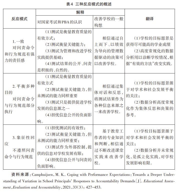 其次,行动性政策研究者引入制度理论剖析学校层面的实践表征。该理论指出个人与组织具有能动力量,会操纵、运用各种符号,来应对外部环境。奥利弗·威廉姆森(Oliver Williamson)便提炼出默认或遵守、展开协商或谈判的妥协、试图隐藏的回避、公开抵制的反抗、尝试目的性控制的操纵,这五种组织中最常见的应对方式。[50]行动者面对政策环境亦有着不同的反应形式,随即映照为不同的“制定”实践,故学者以之为指引开展研究。有研究者挖掘经验性材料将之概化为,同问责要求保持一致的“对齐”(alignment)、采取象征性策略企图蒙混过关的“模仿”(imitation)、制造数据以维持形象的“捏造”(fabrication)以及直接表明公开抵抗的“退出”(opting ou)这四种反应形式。[51-52]亦有学者概化出对齐、平衡多种目的(balancing multiple purposes)与象征性回应(symbolic responses)三种反应模式,[53]并指明模式之下不同的“解释”与“翻译”状态(详见表4)。
