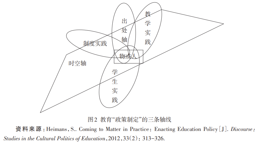 二是斯蒂芬·海曼斯(Stephen Heimans)提炼出三条轴线建构网络模型(model of entanglements),弥补原本拘于制度逻辑、场域理论、再语境化规则理论,线性、片面化剖释结构性因素的弊端(参见图2)。该模型包含三部分:其一是出处轴,涉及一个出处连续体,启发研究者对教育政策的法定(权威)来源以及其历史性实施逻辑(制度逻辑)保持敏感;其二是指向对物质—话语要素,在知识、权力与物质交织的话语实践中思考政策;其三是时空轴线,捕捉在政策过程中发挥作用的多个时空范畴,如时段性运动、流行理念(新自由主义)、地域等。[80]模型中涉及多种理论分属不同轴块以解译“制定”情状,上文所述部分理论亦被垄纳,兹不赘述。需要提及的是,目前所搜集文献中暂未有研究者以该理论模型为指引解释“制定”,但模型中所涉影响因素已得到验证,如劳拉·平托(Laura Pinto)指出,在新自由主义思想支配下,教育政策话语控制权集中到少数私人机构手中,导致教育场域中管理主义盛行,教师的自主权限被压缩,继而其“制定”反应多表现为沉默抵制、虚假表演。[81]