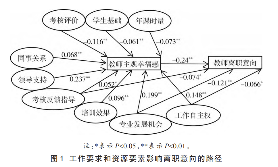 研究发现,工作要求中的6个因素对教师离职意向无直接影响,假设H1不成立;工作资源的7个因素中,专业发展机会、考核反馈指导、工作自主权对教师离职意向直接产生显著负向影响,假设H2部分成立;工作要求的6个因素中,考核评价、年课时量、学生基础对教师主观幸福感产生显著负向影响,假设H3部分成立;工作资源的7个因素中,领导支持、专业发展机会、工作自主权、培训效果、同事关系、考核反馈指导对教师主观幸福感产生显著正向影响,只有考核反馈频次的影响不显著,假设H4绝大部分成立。另外,教师主观幸福感对离职意向也有显著负向影响。最终模型中各变量之间的具体路径关系如图1所示。