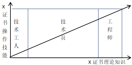 顺应职业教育知识发展逻辑,寻求最佳人才培养生态位。生态位常指在生态系统及其群落中,一个物种与其他物种相关联的特定的时间位置、空间位置和功能地位。[12]论及职业教育领域,不同能力储备的技能人才处在其合适的生态位置,能保持和促进职业教育生态圈内生态因子的动态平衡。H·W·French 在《工程技术员命名和分类的几个问题》一书中提出了职业带理论,认为当今技能人才可分为技术工人类、技术员类以及工程师类。从职业带理论可知,影响职业人才类型的主要因素是人的理论知识和技能知识的结构,从技术工人到技术员再到工程师,对操作技能的要求不断降低,而对理论知识的要求则逐渐提高。三种人才类型尽管在知识发展逻辑上具有层次性,但并非界限分明,而是存在知识结构和能力发展的关联性。在职业带理论基础上,结合培训评价组织的工作职责,绘制出如图1所示的X证书制度下技能人才知识发展逻辑图。随着智能化时代的到来,企业组织形式也相应发生了变化。组织呈现出的发展趋势是内部联结越来越松散,对信息流的依赖越来越重,自我维系和再生的能力越来越强,对环境则是越来越开放。[13]原有科层制组织形式向松散偶联的组织形式发展,大规模的生产由智能化工业设备完成,需要技能人才从事的工作主要是定制化或单件制的柔性化生产。在生产组织方式变革的背景下,产业领域对技能人才知识结构的深度和广度也提出了新的要求,即要求人才具有较强的将理论与技能复合的能力。培训评价组织政策引领职业教育顺应其技能人才知识发展逻辑,通过X证书制度将知识结构不同的人安排在其适合的岗位上,形成有序的职业教育人才培养生态位序列。