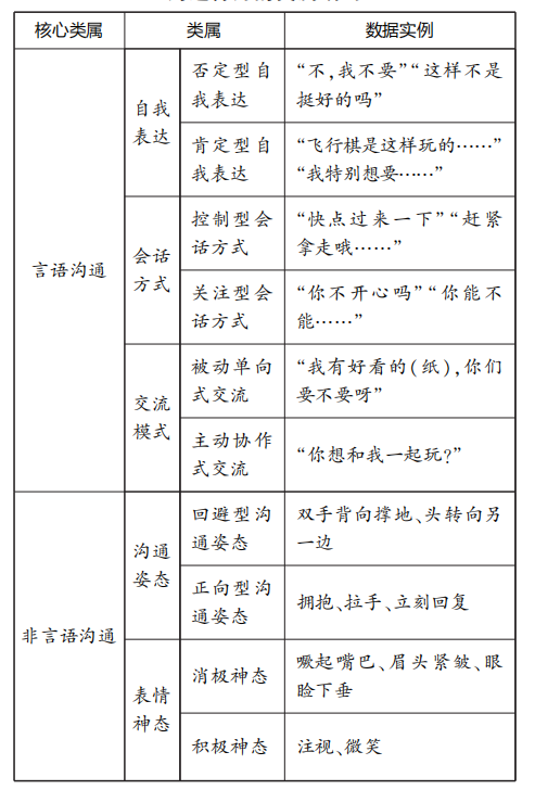 在一级编码阶段,本研究采取聚类编码和开放式编码相结合的方式,分别对文本中幼儿重复、相似、变异的言语沟通模式和非言语沟通模式进行编码。沟通情境中另一方幼儿的认知情感体验和“语用交流行为目录”(INCA-A编码系统)[5]是编码时的主要参考依据。最终,本研究归类了34个一级编码,其中一级编码受欢迎型幼儿和被拒绝型幼儿各为19个和15个。在二级编码阶段,研究者通过分析各节点之间的联系,将34个一级编码重组合并成了5个二级编码:分别为自我表达、会话方式、交流模式、沟通姿态、表情神态。在三级编码阶段,研究者通过对已发现概念类属的系统分析,选取言语沟通和非言语沟通作为本次研究的核心类属。本研究对沟通行为的类属编码如表1所示。